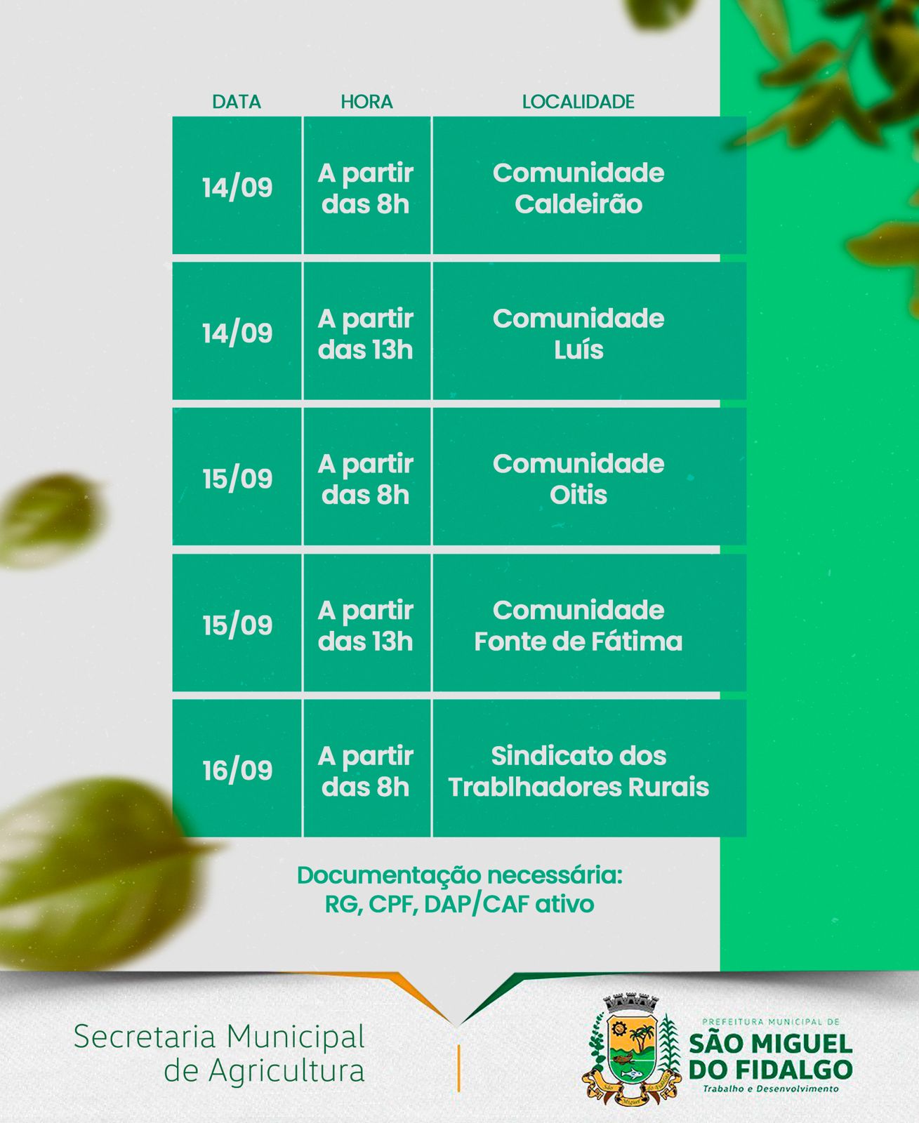 Os produtores da agricultura familiar de São Miguel do Fidalgo poderão se inscrever no programa Garantia Safra de 14 a 16 de setembro, conforme o cronograma divulgado pela Secretaria Municipal de Agricultura. O benefício é uma ação do governo federal, através do Programa Nacional de Fortalecimento da Agricultura Familiar (Pronaf).