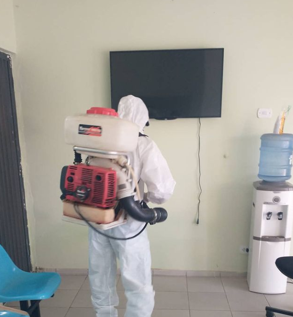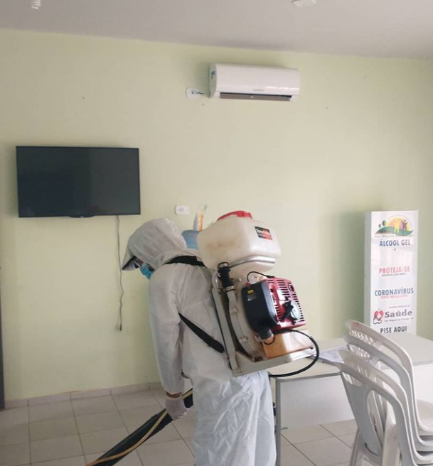 Na segunda, dia 10, aconteceu a sanitização no prédio da Unidade Básica de Saúde e vai ser feita também nas praças, casas lotéricas, supermercados e mercado público.